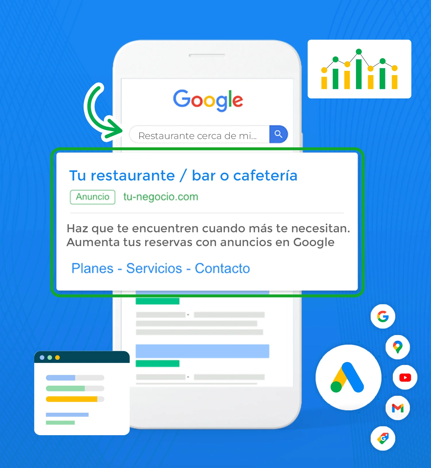 - Aumentar tus reservas rápidamente gracias a campañas publicitarias diseñadas para atraer clientes publicadas en redes sociales y Google.