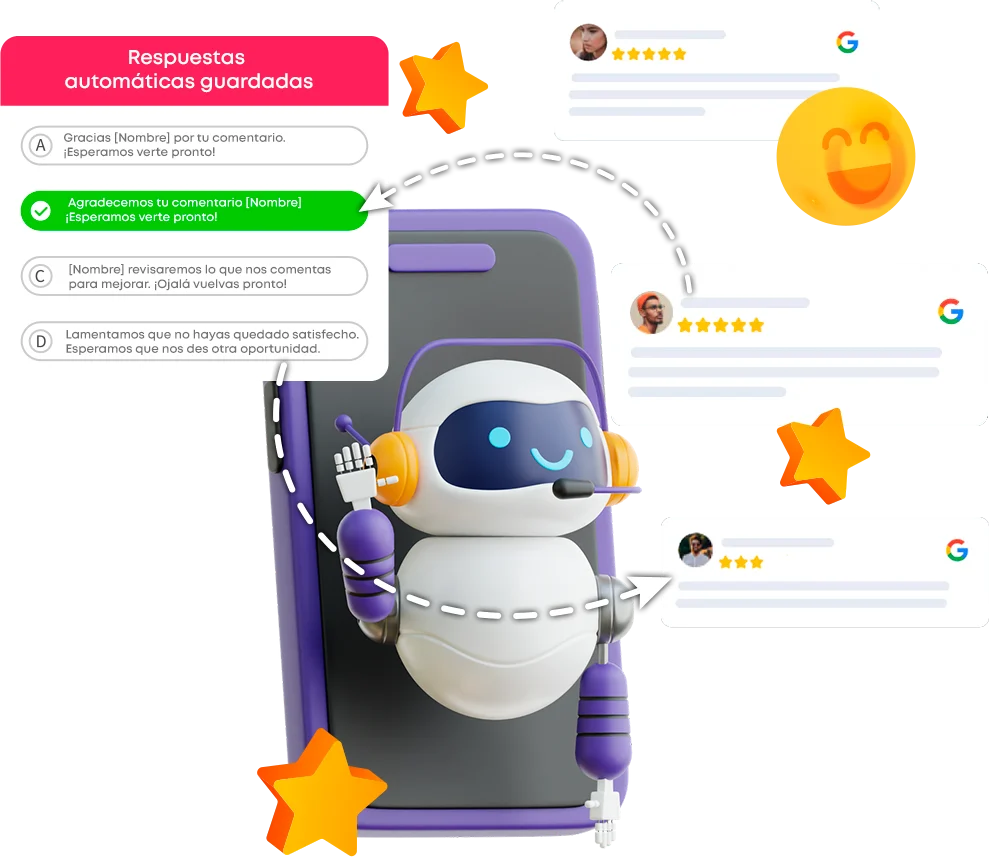 - Olvidarte de responder de forma manual las reseñas, ¡se contestan solas (respuesta personalizable según la valoración)!.
